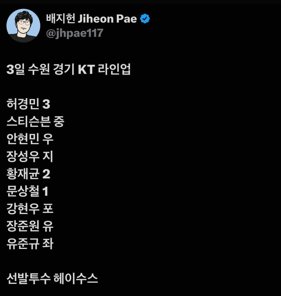 KT 위즈 라인업 작성자 정보 로로랜드쪽지보내기 메일보내기 자기소개 아이디로 검색 전체게시물쪽지보내기 메일보내기 자기소개 아이디로 검색 전체게시물 작성 작성일 2025.09.03 16:48 컨텐츠 정보 80 조회 1 댓글 목록 본문 선발투수 헤이수스 (와이프 몸매 지림) 관련자료 이전 후달달 작성일 2025.09.03 17:18 다음 기아 타이거즈 라인업 작성일 2025.09.03 16:46 댓글 1 마당발님의 댓글 마당발쪽지보내기 메일보내기 자기소개 아이디로 검색 전체게시물쪽지보내기 메일보내기 자기소개 아이디로 검색 전체게시물 작성일 2025.09.03 18:31 굿 굿 로그인한 회원만 댓글 등록이 가능합니다. 목록